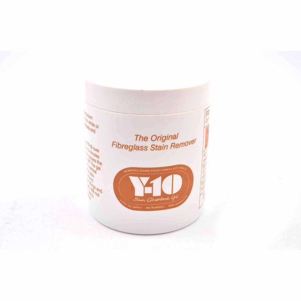 Directions: Spread a thin coating of Y-10 over the stain, wait a few minutes while a mild chemical reaction causes the stain to vanish, then wash it off. The gel spreads easily and adheres to vertical surfaces. Also effective against rust stains and may be used on painted boats. Y-10 comes in 325g jars containing enough gel to remove waterline stains on a 26-footer twice!