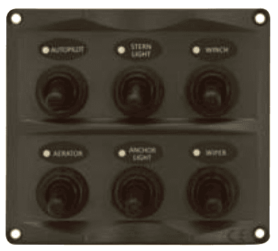 A heavy-duty toggle switch panel with a compact panel size.