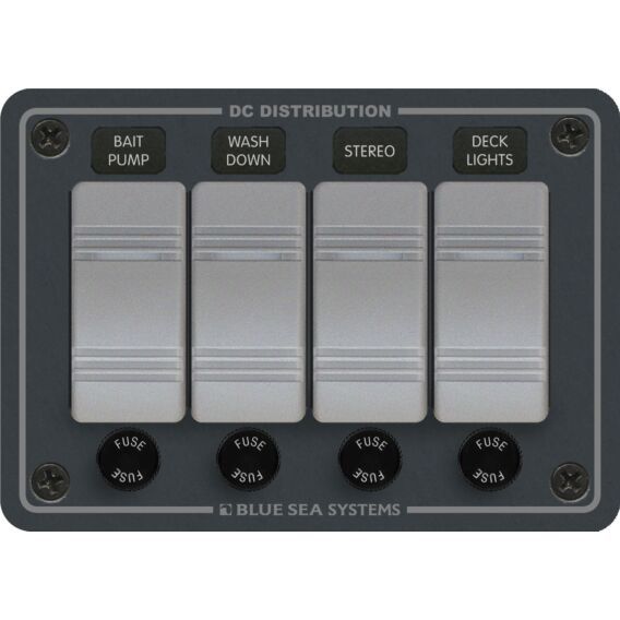 The Blue Sea Systems Contura Water Resistant DC Panel (12V 4 Position) is a durable and reliable power distribution system for marine applications. Designed for 12V DC systems, this panel features four illuminated Contura rocker switches, providing easy control over multiple circuits.