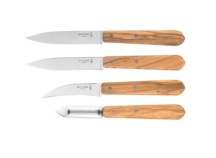 The handles of this set are made with beautiful olive wood that is soft to the touch and looks clasically mediterranean. A lovely set that's simple, versatile, wonderfully effective whilst creating a lovely look in any creative cooks kitchen. A perfect gift.