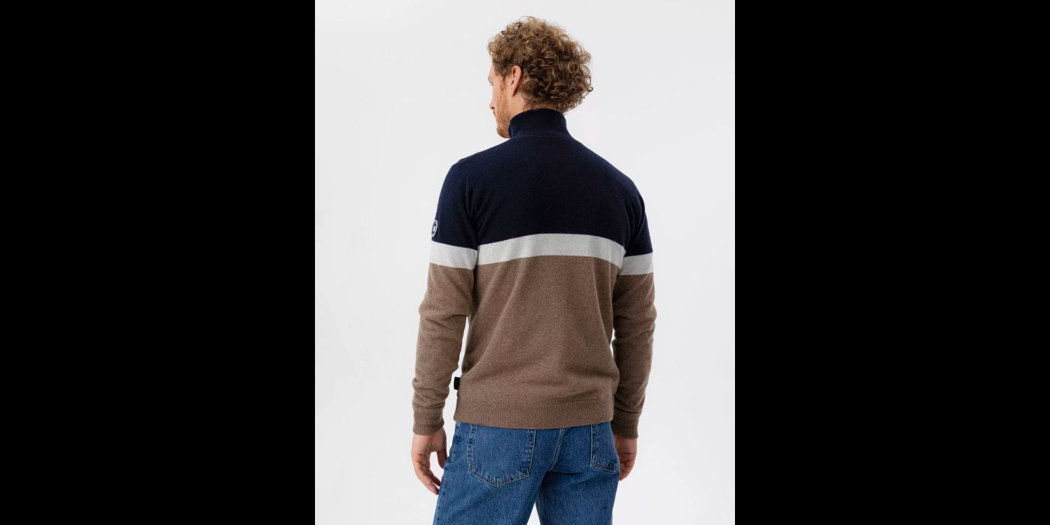 A ribbed collar with contrasting details and ribbed endings - a very smart look.