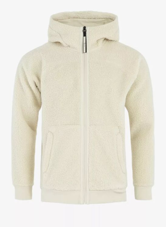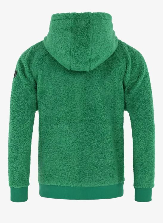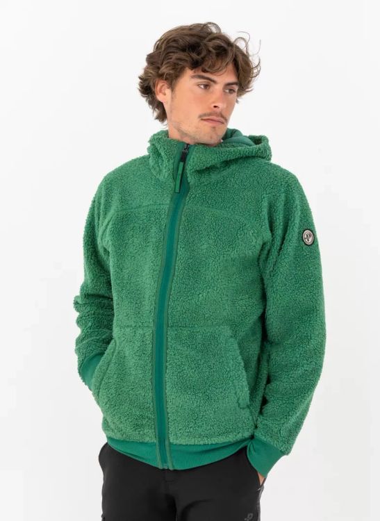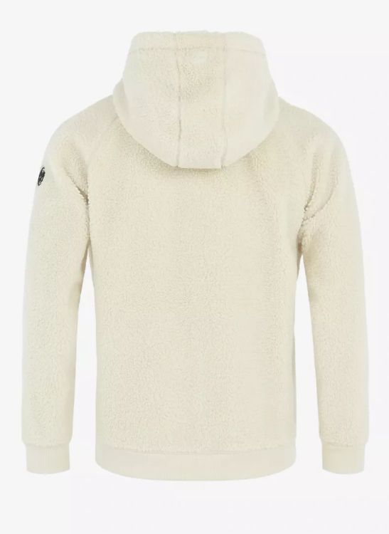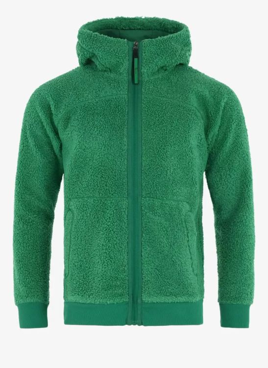 Made of recycled polyester pile, this hoodie has a lined hood, ribbed cuffs, and two front pockets.