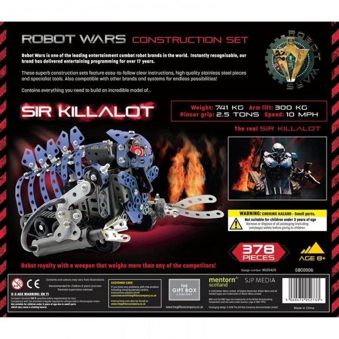 The Robot Wars 'Sir Killalot' Construction Set is a complete kit that contains everything you need to build the iconic 'Sir Killalot' robot from the BBC TV series. If you're a fan of the programme, or just fancy a satisfying little challenge for yourself or any budding engineer, aged (roughly) 8 upwards, then this construction kit will hit the spot! It includes all of the tools you need and easy-to-follow instructions are included.
