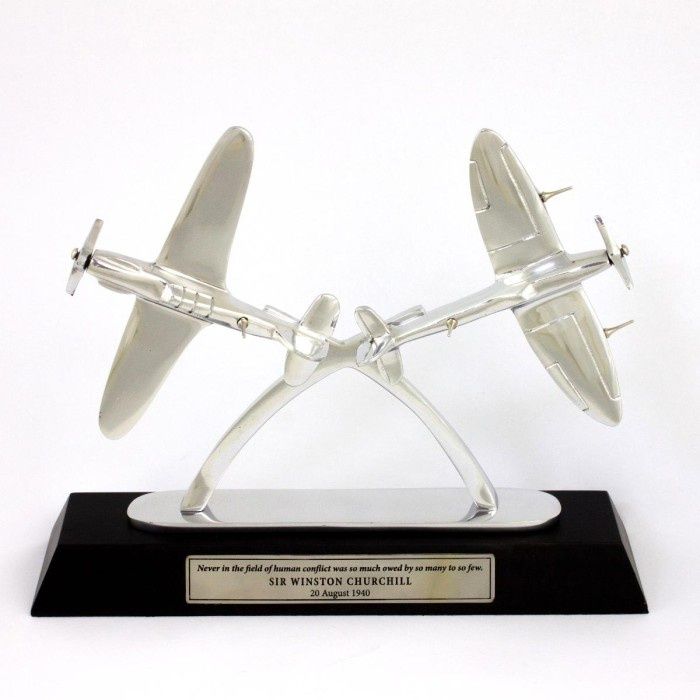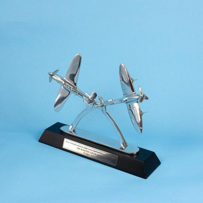 This unique sculpture unites Battle of Britain heroes Spitfire and Hurricane on a plinth featuring Sir Winston Churchill's famous tribute "Never in the field of human conflict was so much owed by so many to so few". The aircraft has been cast in solid aluminium and polished to such a high sheen that their subtle curves and angles catch the light beautifully.