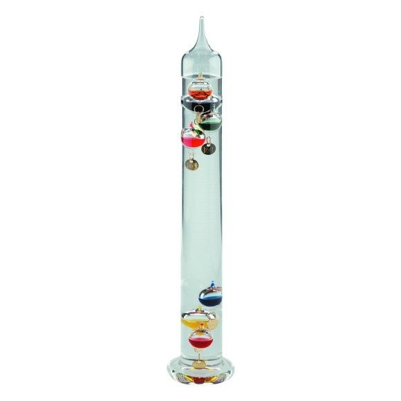 Featuring 7 colourful floating globes, each precisely weighted and calibrated, this eye-catching thermometer tells the temperature based on the principles discovered by Galileo Galilei in the 1600's. These distinctive ornamental (but functional) thermometers utilise 17th century astronomer Galileo Galilei's discovery that the density of liquids varies with temperature.