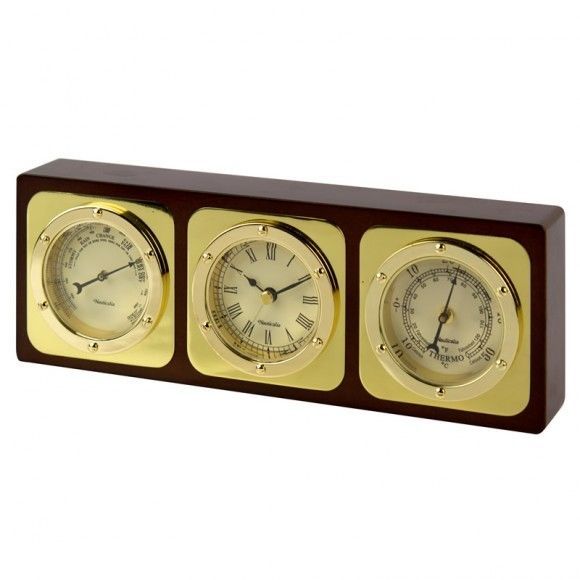 A beautifully set brass clock, barometer and thermometer all in one polished wooden case, giving you all the information you need at a glance.