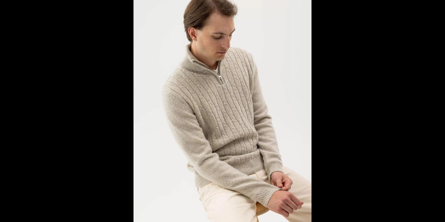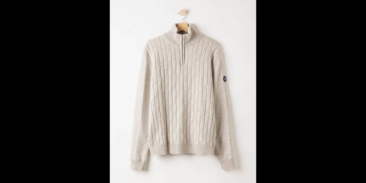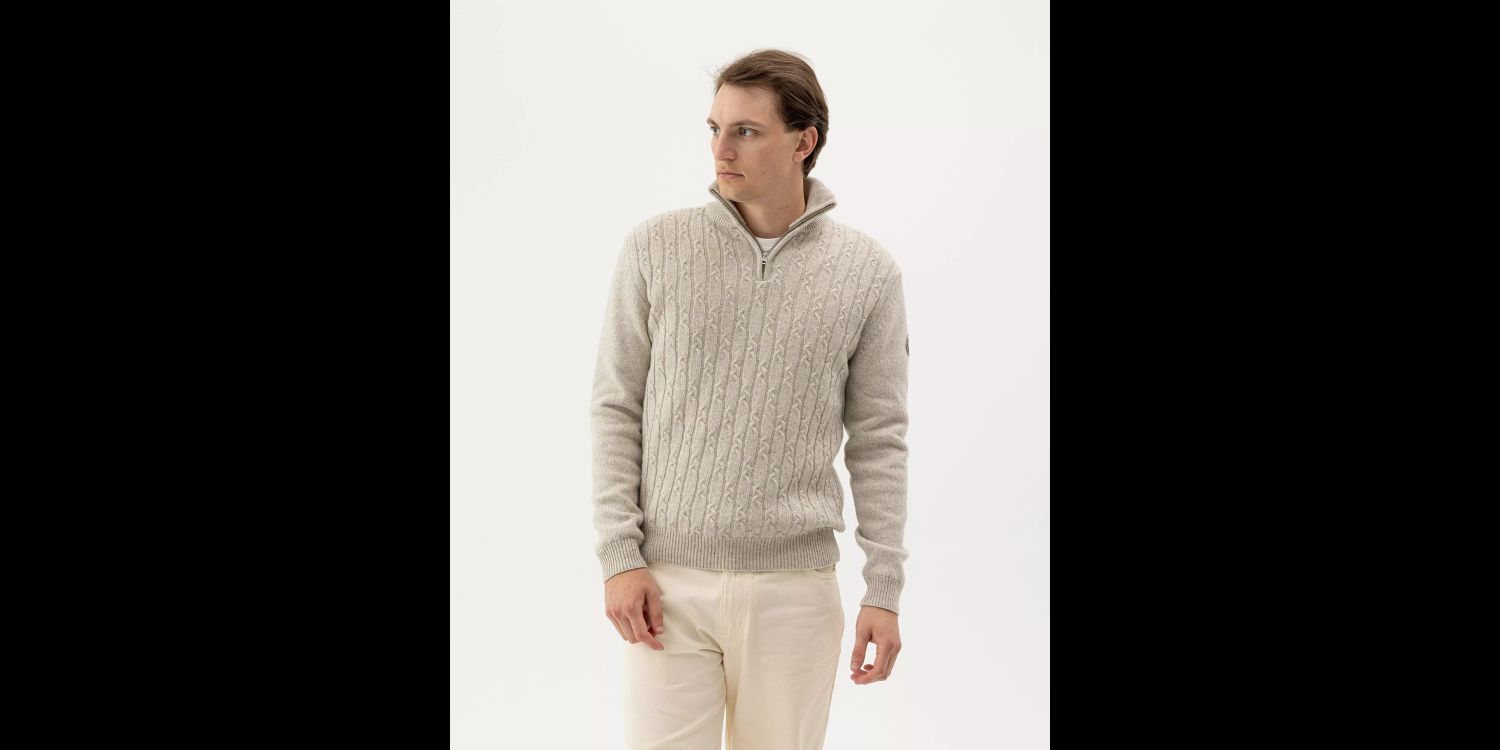 A superbly stylish windproof knitted sweater in cosy merino wool and cashmere from Holebrook, featuring a cable-knit front.