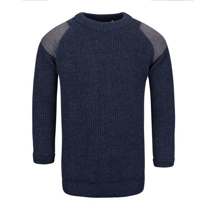 The ribbed crew neck is made using wool from sheep that roam in the Pennine Hills. An incredibly warm and tough sweater with tweed patches on the shoulders; added using a twin needle stitching for durability.