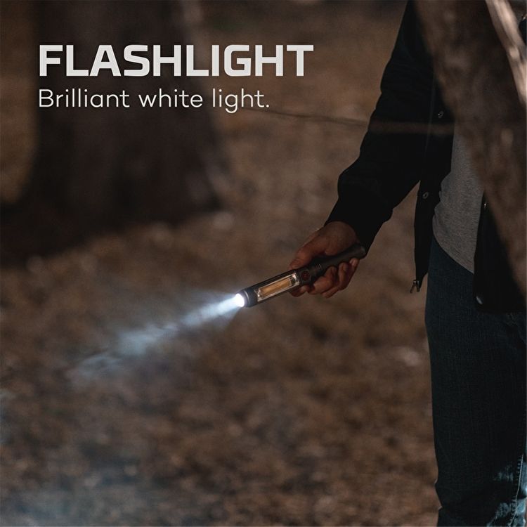 With 7 different light settings, the Franklin Dual from NEBO is a powerful rechargeable portable flashlight and working light. The strong LED chip in the flashlight of the DUAL can beam up to 75 metres away, while the work light uses COB technology. Up to 40 hours of continuous use are possible with the included battery between charges.