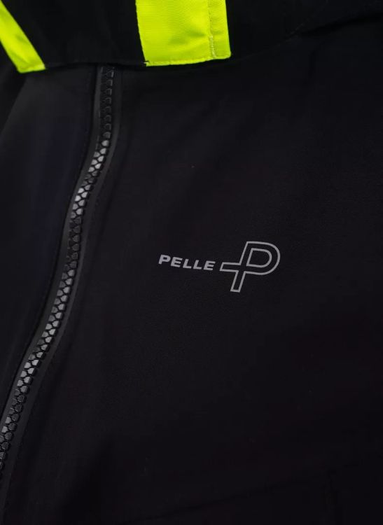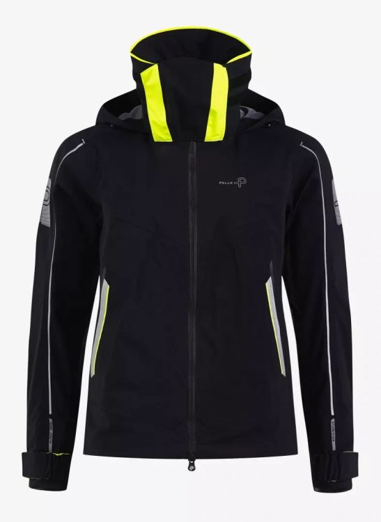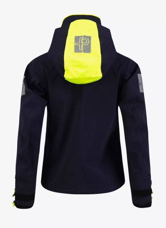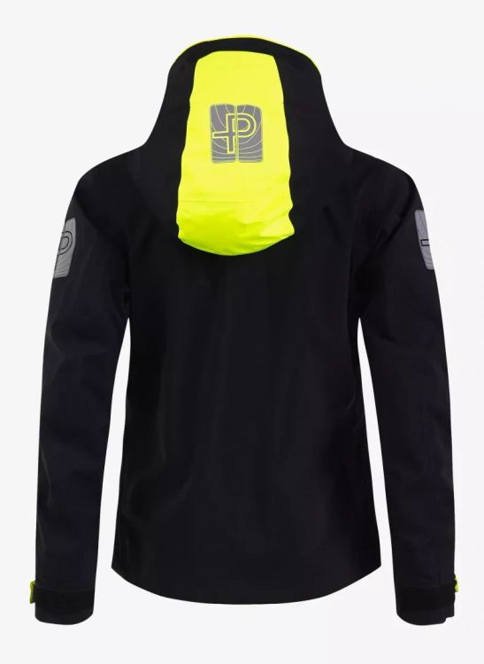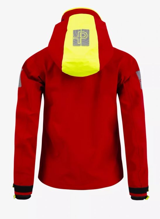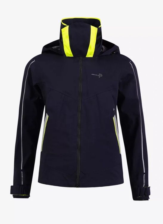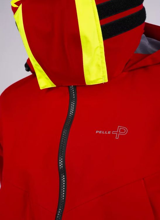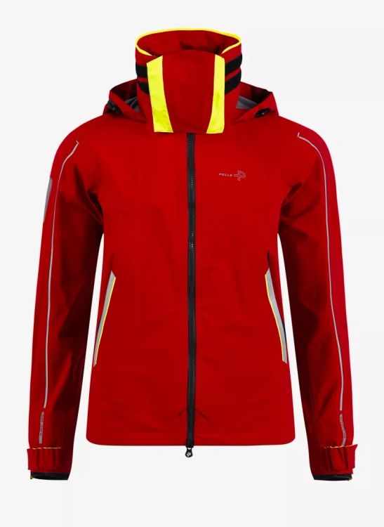 This technical sailing jacket has taped seams, articulated sleeves for full movement, and fluorescent details and reflexes for increased visibilty. The high collar has soft fleece sections and an adjustable fluorescent hood.