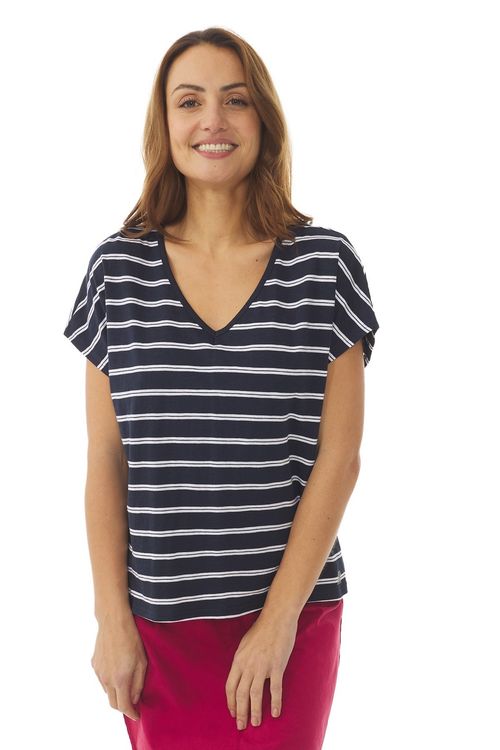 This classic, comfortable t-shirt from French brand Mousqueton. Made with 100% cotton jersey which is wonderfully breathable and comfortable, with a stylish batwing sleeve.The v - neck and short sleeves make it a versatile piece for layering or wearing alone in the warmer months.