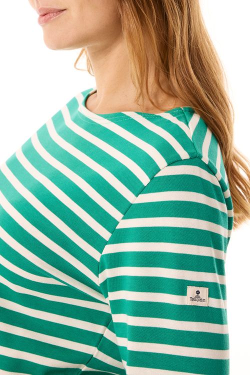 A flattering, comfortable and soft 3/4 sleeve striped top that’s fitted at the waist and features a boat neckline.